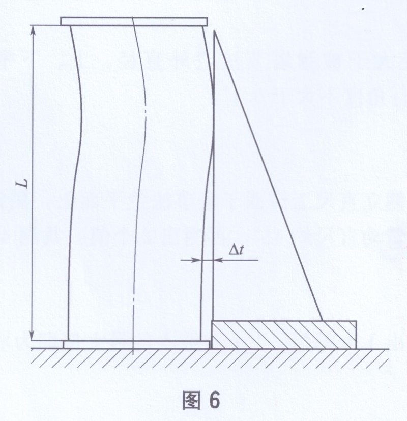 將被測(cè)塔節(jié)法蘭端放置在平臺(tái)上,在緊靠法蘭邊處墊放一平行度標(biāo)準(zhǔn)圓墊塊,用直角尺貼靠在塔節(jié)壁上 (如圖6所示),旋轉(zhuǎn)塔節(jié),用塞尺量取旋轉(zhuǎn)一周中塔節(jié)壁與直角邊的最大距離AL,此值即為塔節(jié)直線度。
